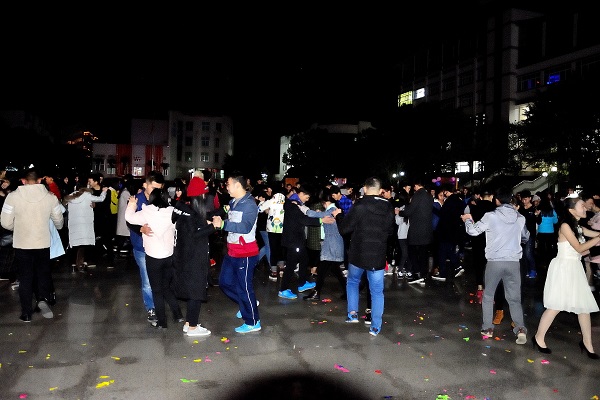 舞会由能源与建筑环境学院所带来的一个舞蹈拉开了帷幕,随后在寒冷的夜空下,主持人宣布本次周末舞会正式开始。九步恰恰丶十六步丶快闪丶兔子舞等惟妙惟肖的舞步逐一展现在青春广场上,天气虽冷,但同样阻挡不了同学们的热情。优美的舞姿与动人的音乐相互辉映,一步一步向你靠近,携手谱写更美的舞步,交谊舞中的温馨场面,更是吸引众多同学围观欣赏。最后,一曲《感觉自己萌萌哒》把舞会推向了高潮。