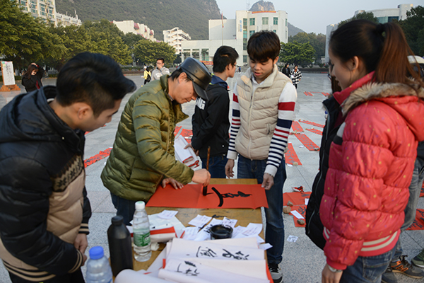 时光荏苒,岁月如梭。在这新春佳节到来之际,为了更好的弘扬我国优秀传统文化,我系联合萤火虫书画协会于2016年12月30日在北校区青春广场举办了“楹联春,迎新梦”送春联活动,为我校莘莘学子送上最温馨的祝福。我系分团委副书记李昕恬老师、萤火虫书画协会指导老师李红文老师出席了本场活动。